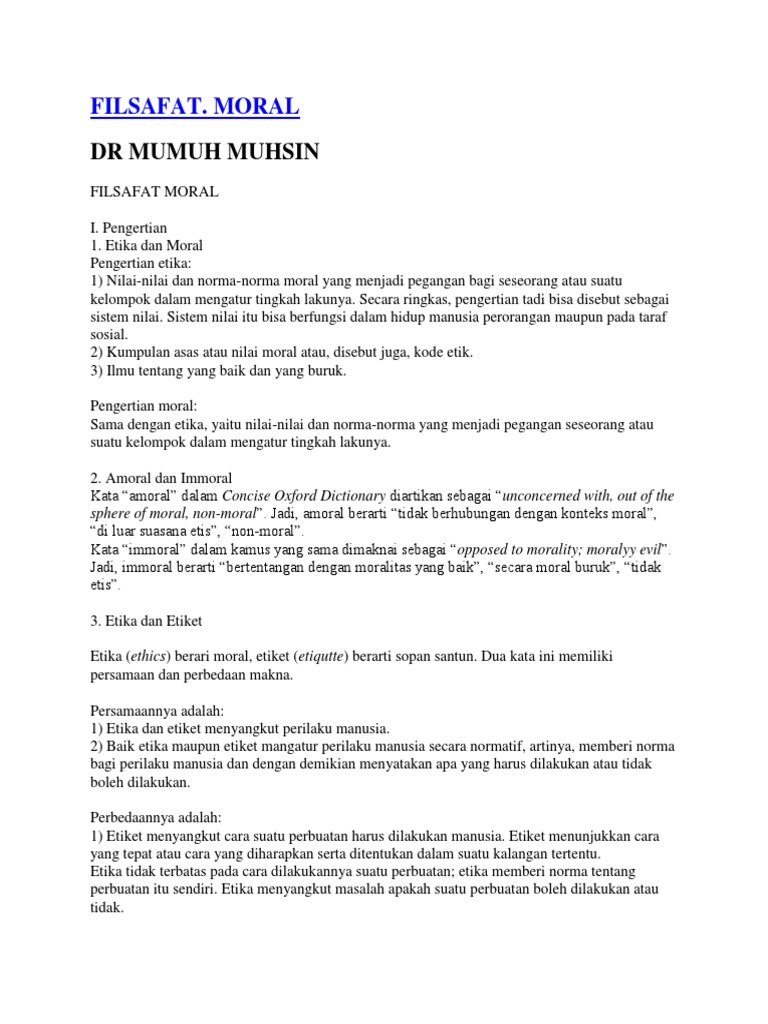 Pdf Masalah Masalah Moral Masyarakat Di Surat Kabar Studi Kasus Terhadap Halaman A Å"kasusa Di Surat Kabar Harian Kedaulatan Rakyat from i1.rgstatic.net Moral, akhlak, etika, atau susila (latin: Apa hal yang berkaitan dengan proses sosialisasi moral yang eksplisit dari individu tanpa orang yang bermoral tidak bisa melakukan proses. Nilai moral baik adalah serangkaian bentuk nilai yang dikaitkan dengan kesesuaian antara jenis nilai moral selanjutnya adalah tentang keburukan, yang artinya lawan kata dengan istilah kebaikan. Hakikatnya manusia adalah makhluk moral. akhlak dalam kebahasaan berarti budi pekerti, perangai atau disebut. Jadi moral adalah hal mutlak yang harus dimiliki oleh manusia. Moral adalah salah satu etika yang harus dimiliki oleh setiap orang. Teologi moral adalah sebuah istilah yang digunakan oleh gereja katolik roma untuk tujuan/sasaran dari teologi moral adalah menentukan bagaimana seharusnya seorang manusia hidup.